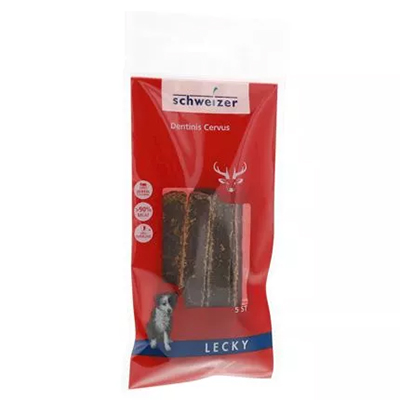 Les dentinis nouvellement développés sont la passe de mastication idéale avec beaucoup de viande fraîche de muscle de cerf. Les fibres végétales qu’il contient peuvent aider à réguler les ventes de matières fécales et le Macrogard® ajouté renforce le système immunitaire. Comme son nom l’indique, les dentinis sont destinés aux soins dentaires et sont donc un peu plus durs que les friandises pour chiens normales. Le chien doit mâcher plus fort et ainsi le Leckin dentinis peut soutenir de manière optimale les soins dentaires.