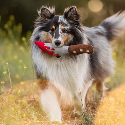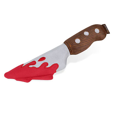 La peluche pour chien en forme de couteau d’Halloween de Pet Play couine légèrement pour stimuler votre chien pendant le jeu. Le papier sonore à l’intérieur stimulera votre chien pour des heures et des heures.