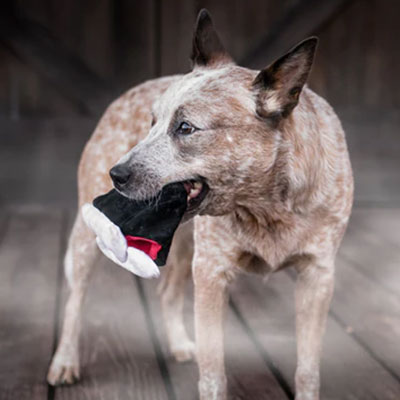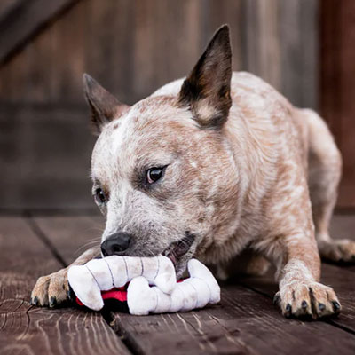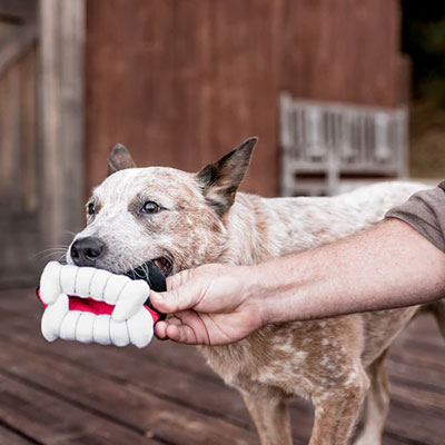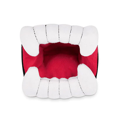 La peluche pour chien en forme de Dents de Dracula 🧛 de la collection Howling Haunts de Pet Play couine légèrement pour stimuler votre chien pendant le jeu. Le papier sonore à l’intérieur stimulera votre chien pour des heures et des heures.